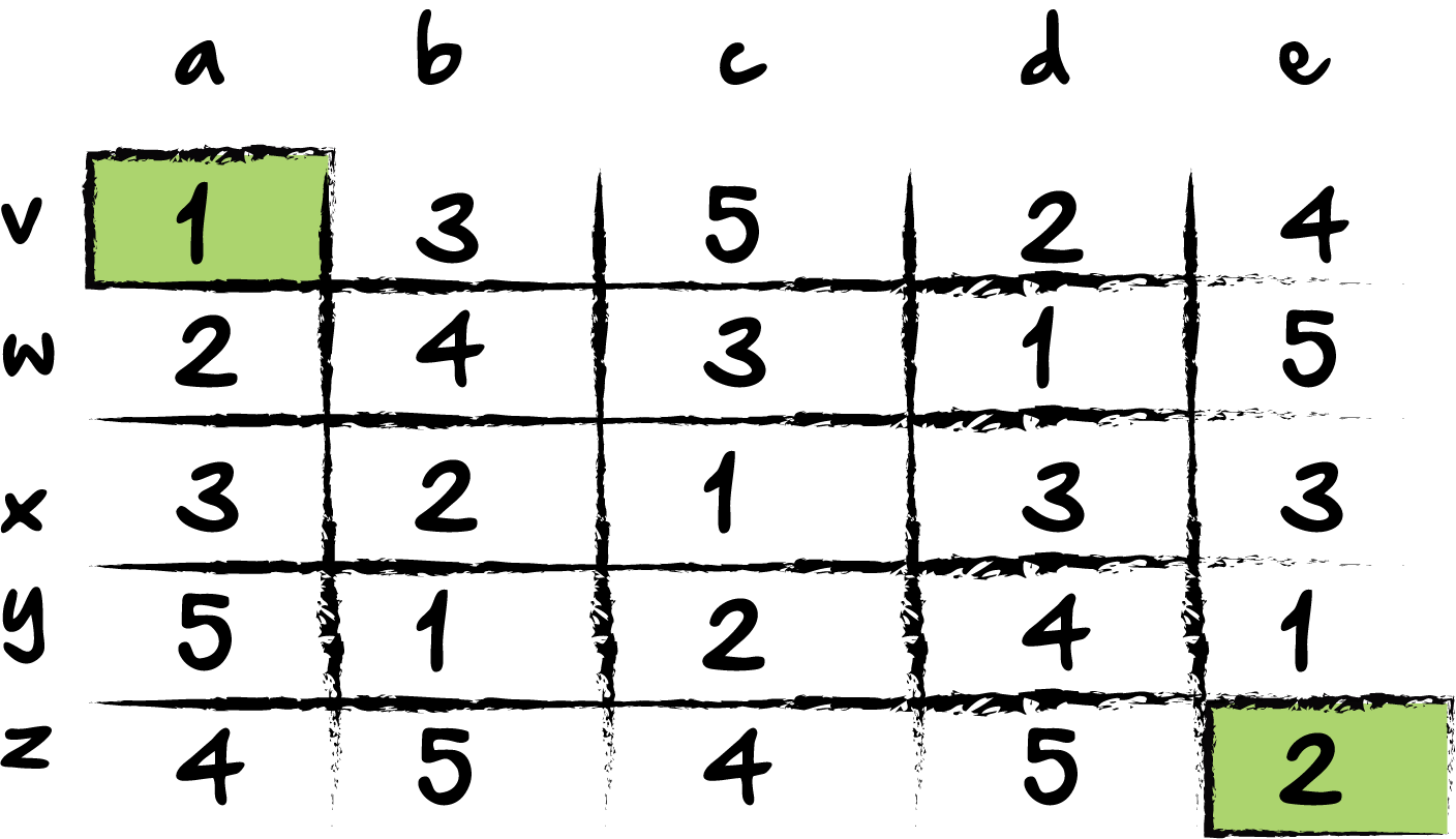 In this visual, I’ve decreased the value of each number, and given reference points to each grid value. For example, the first grid item could be referenced by the coordinates (a,v). This will help us determine which value we are referencing. When we move from pseudo code to real code, we will probably use an array, and can reference values by indices instead.