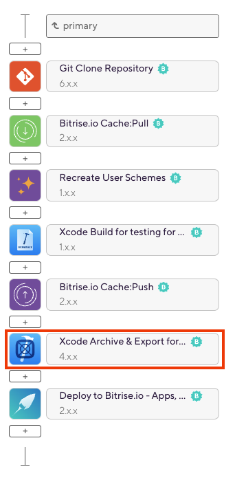 Start by adding the “Xcode Archive & Export for iOS” Step after the “Bitrise.io Cache:Push” Step. This Step will be used to code-sign the previously built assets and then export the .ipa (and other assets).