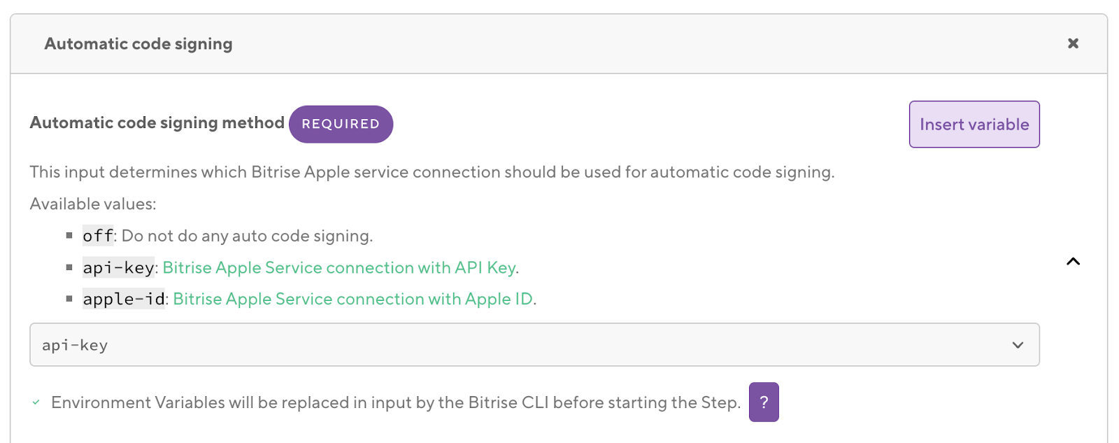 Next, you need to choose the automatic code signing method, which defines which Bitrise Apple Service connection (e.g. API Key or Apple ID) option will be used.