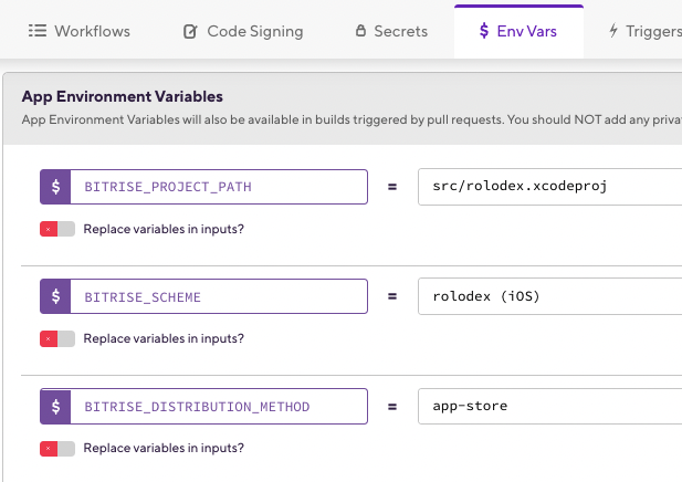 The great news here is that these values have already been added for you, as part of the initial iOS project setup. You can see what’s already been configured by clicking and displaying the Env Vars tab.