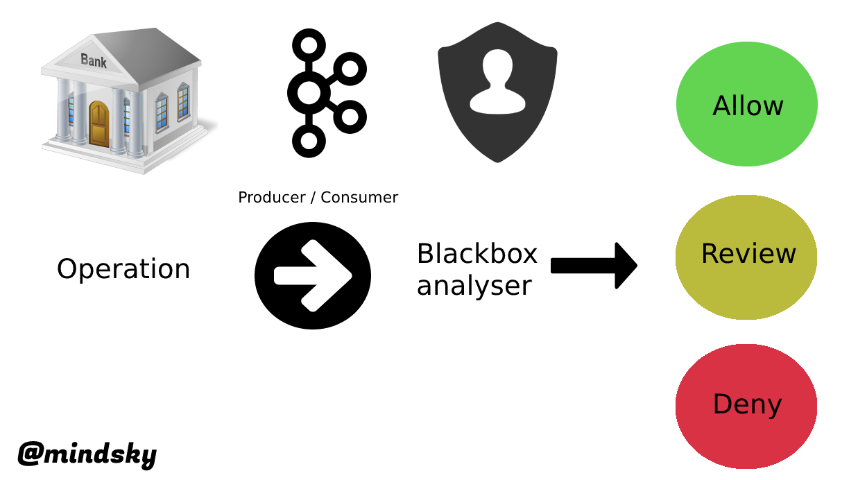 If the system is being built from scratch, we need to obtain transaction traffic. The simplest way is to use some message broker. In our example, we are working with Kafka. Any anti-fraud system receives one of three decisions: