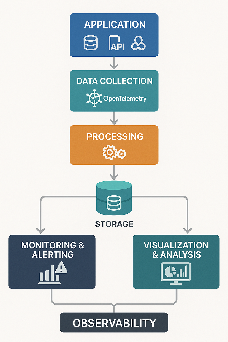 Okay, here’s a simplified scheme — not perfect, but pretty close. And yes, it may look like traditional monitoring at first glance. But there’s one key difference that makes observability a whole different game: Analysis.