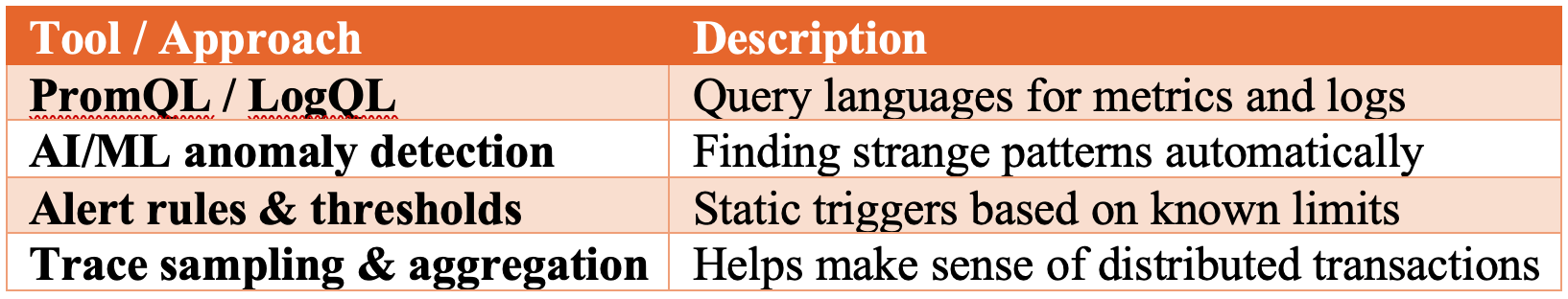 - Event correlation – linking logs, metrics, and traces to understand cause and effect.