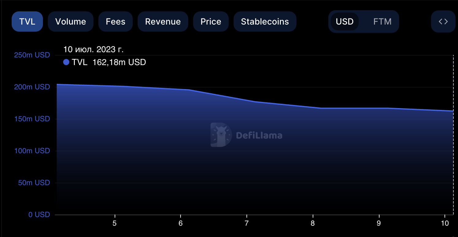 And unfortunately, this hack affected the Fantom chain in general and the $FTM token as well. Some people were trying to save their investments and transfer funds to another chain, some were shorting $FTM. As a result, the price went down. Regarding the chain itself, all of the lending/borrowing protocols were stopped because of the depeg of 3 stablecoins on the chain that were operated by Multichain. Total TVL of the chain reduced by about $40m in a few days due to Defillama