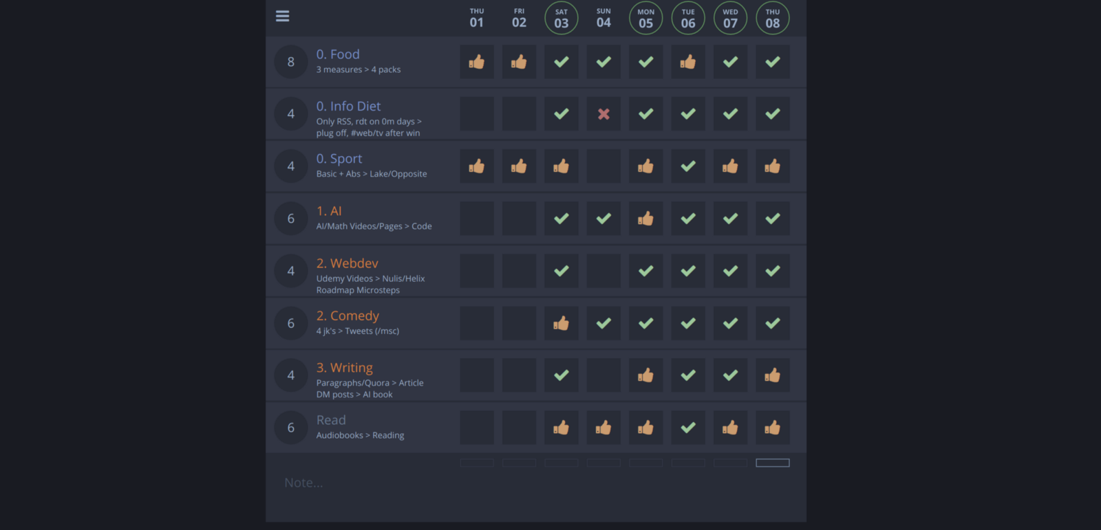 I’ve developed an app that helps me to track my habits, and currently they look like this: