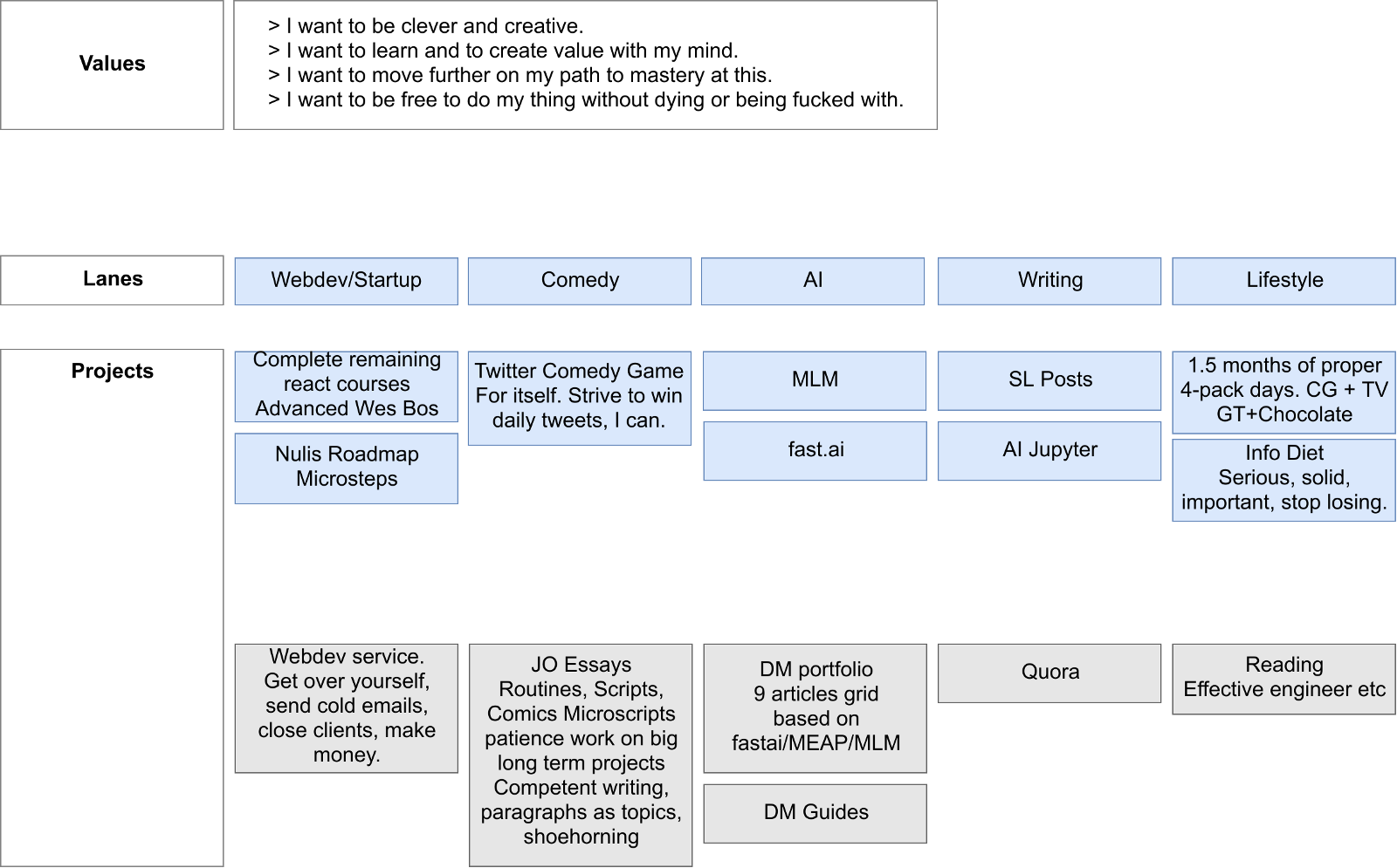 I organize my lanes using draw.io app, it’s a constantly evolving document. I keep continuously tweaking and rearranging my lanes as I learn more about life, myself, and ways to approach my goals. It’s current version looks like this: