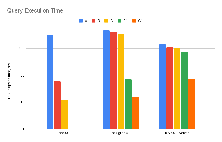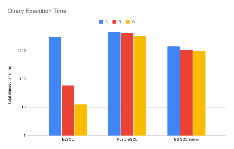 All databases perform pretty much the same on column A, where data cardinality is high (100 thousand unique values out of 1 million rows). PostgreSQL total execution time was 4.72 seconds, MS SQL Server - 1.42 seconds, and MySQL - 3.11 seconds. But on column B, where cardinality is only 1000 unique values, MySQL total execution time drops to 58.6 milliseconds, while PostgreSQL does it in 4.2 seconds and MS SQL Server 1.08 seconds. **MySQL completes the second query 70 times faster than PostgreSQL and 18 times faster than MS SQL Server.**The situation is even better on column C, where there are only 10 unique values: MySQL - 12.5ms, PostgreSQL - 3.33s and MS SQL Server - 1.02s. **In the last example MySQL is blazingly fast and outperforms PostgreSQL by more than 250 times and MS SQL Server by more than 80 times.