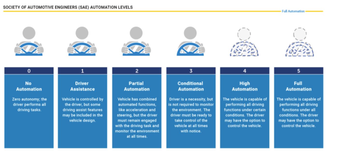 - Full Automation (Level 5). This level characterizes the vision many have for the future of transportation. Such vehicles don't need a driver: they can travel safely in any environment and under any weather conditions, thanks to their highly sophisticated AI systems.