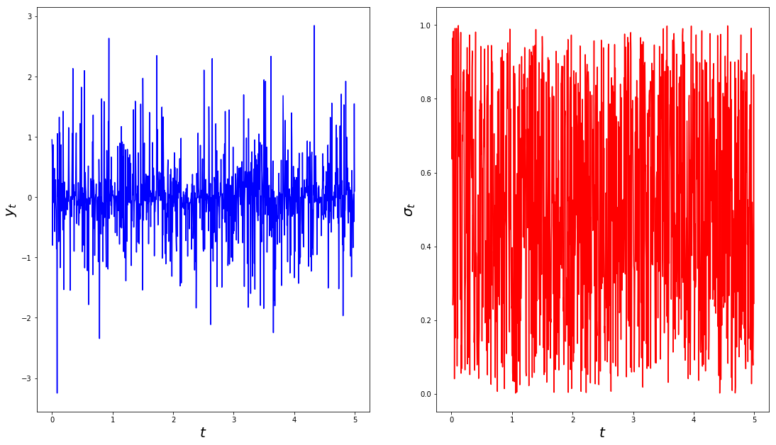 A non-stationary memoryless time series (left) and its time-varying standard deviation (right).