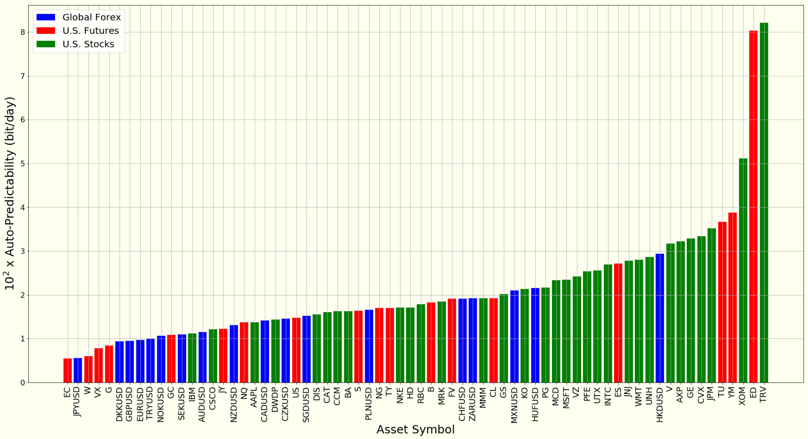 In our Yellow Paper, we propose a maximum-entropy based approach for estimating PR({X}). The following plot illustrates how much memory there is in stocks, futures and currencies.