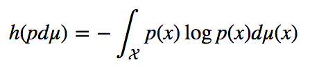The entropy of a probability distribution with density function p with respect to a base measure dμ. The entropy of a random variable is that of its probability distribution.