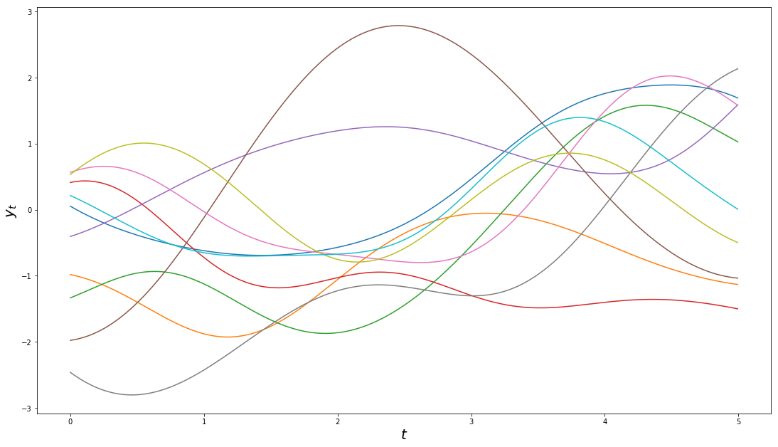 Independent random draws from the same stochastic process, a mean-zero Gaussian process with Squared-Exponential covariance function, with output and input scale 1.