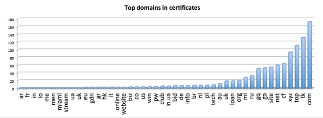 .com is not a surprise, .tk, .cf, and .ga are free domain services. .top is one of the new domains, just like .xyz. The first national top domain in the chart above is Bulgaria, followed by Russia, and the UK.