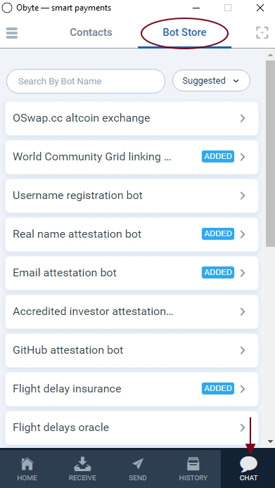 A chatbot could do practically anything, and its function is usually clear from its name. Any user of the Obyte wallet can visit the section “Chat”, and go to the “Bot Store” to explore the available bots. They could be exchanges, identity attestations, oracles, faucets, payment channels, insurance or sports betting. The user only needs to “add” (pair) them as contacts and follow their instructions.