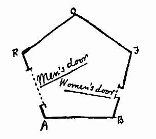 The most common form for the construction of a house is five-sided or pentagonal, as in the annexed figure. The two Northern sides RO, OF, constitute the roof, and for the most part have no doors; on the East is a small door for the Women; on the West a much larger one for the Men; the South side or floor is usually doorless.