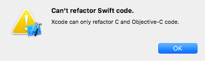 Adding insult to injury, I certainly can’t refactor my stuff either! In fact, try use anything from Xcode 8’s (7, or 6!) ‘Refactor’ menu and you’ll get this depressing dialog box.