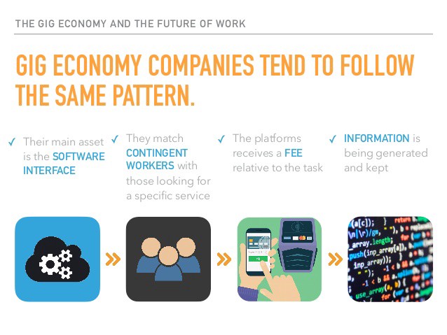 The ‘gig economy’ essentially means “Uber-ization” of the workforce in the coming decades. Every service which could be outsourced will be, and will be done so on a demand basis.