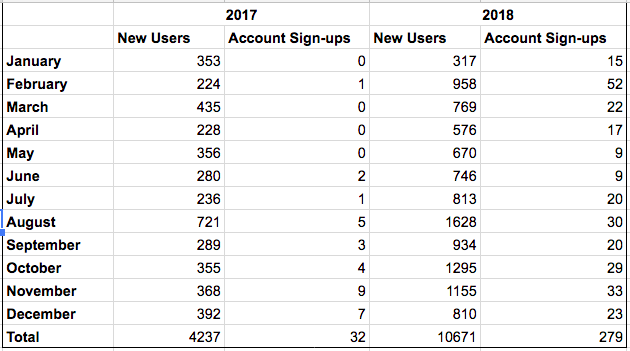 Without spending much time on SEO, our website traffic went from about 4,000 unique visitors in 2017 to over 10,000 unique visitors in 2018. More importantly, account sign-ups grew from 32 in 2017 to 279 in 2018.