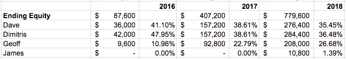 Dave and Dimitris spent some time setting up our development infrastructure at the end of 2016 and invested more time in the business throughout 2017 as they worked to deliver our minimum viable product. Our founding team worked an equivalent number of hours throughout 2018, but Dave and Dimitris also kicked in some cash to cover our operating expenses which explains the differences you see in the equity allocation between each of us.
