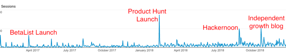 In addition to these launches the other major spikes in traffic were a result of another company’s blog post published on Hackernoon that did really well and linked to one of our own blog posts and one of the most successful articles that we published on our own blog, 4 SaaS Start-ups And Their Quest For Independent Growth.