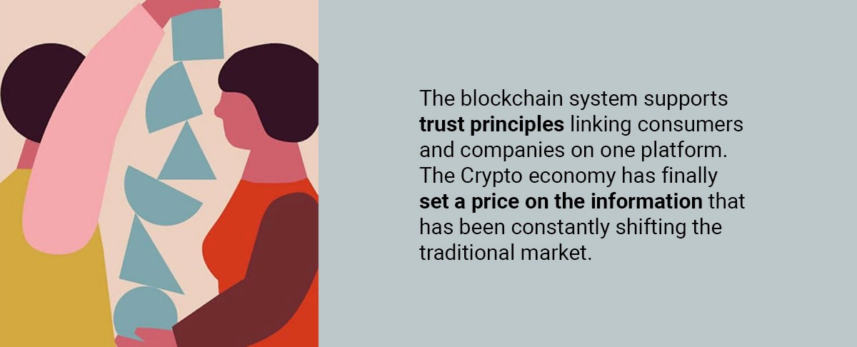 The crypto economy gives answers to questions raised by the traditional markets. Recommendation systems are missing transparency since reviews are not linked to payment accounts, which makes the verification process nearly impossible. Blockchain technology responds to this issue with a simple solution to anonymously track data on purchases and to encourage consumers to share their first-hand experiences while, at the same time, being rewarded with cryptocurrency.