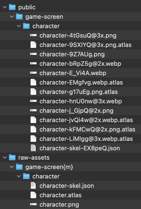 game-screen{m}: Contains all game assets and starts loading after the loading screen is shown.load-screen{m}: Assets used in the loading screen. These are unloaded once the screen is hidden to save memory.shared{m}: Assets used by both the loading screen and the game.ui{m}: UI assets, separated for easier management (though they can be put in the game-screen folder).