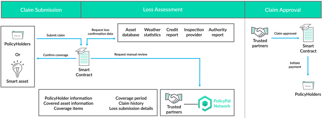 P2P Mutual Aid insurance claims process using the blockchain technology for claims automation, taken from PolicyPal Network whitepaper found here (PDF)