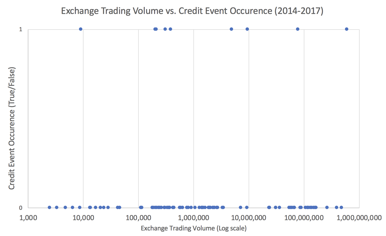 The first relationship we investigate is between daily exchange trading volume and credit occurrence. Following the results of the prior paper, larger exchanges are expected to suffer more credit events as they are more attractive targets for hackers. A logical counter-argument to this would be that larger exchanges would have better security practices.