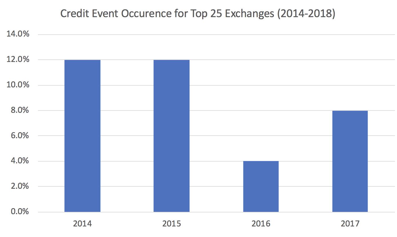 Exchanges with daily volumes below $500,000 (such as Gatecoin) have been just as likely to suffer credit events as exchanges with over $500,000,000 of volume (such as Bithumb).
