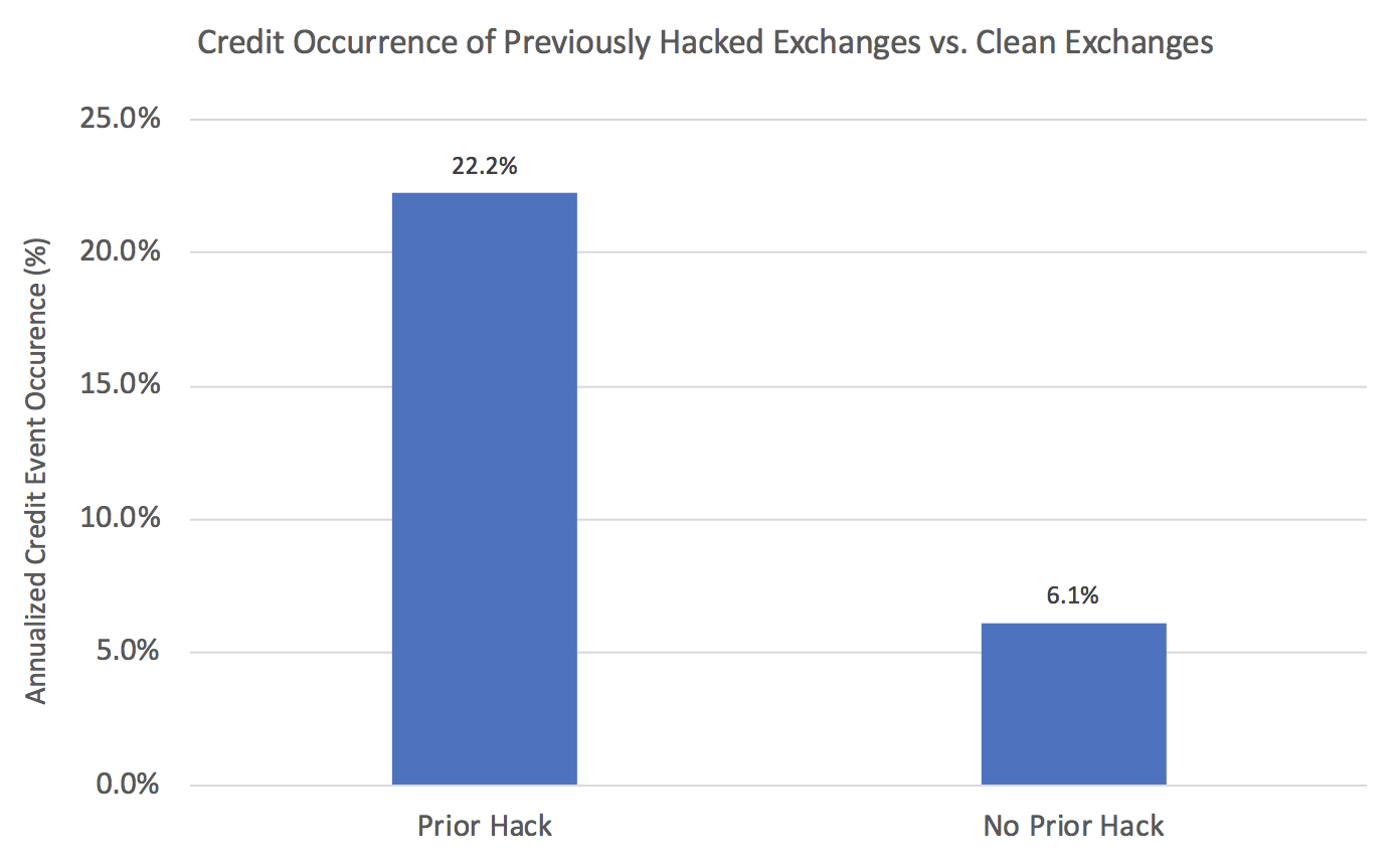 Exchanges that have been previously hacked historically suffered credit events at a rate of 22.2% per year. In contrast, “clean” exchanges that have never been hacked before suffered credit events at a rate of 6.1% per year.