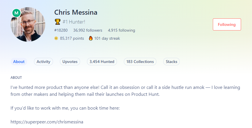 Once you’ve prepared your pitch and hunter kit, it’s time to reach out to hunters. Email is usually the best way to contact them, but if you can’t find their email, Twitter DMs can work too. In some cases, hunters may have created a page like Chris Messina’s here, which makes it easier to contact them.