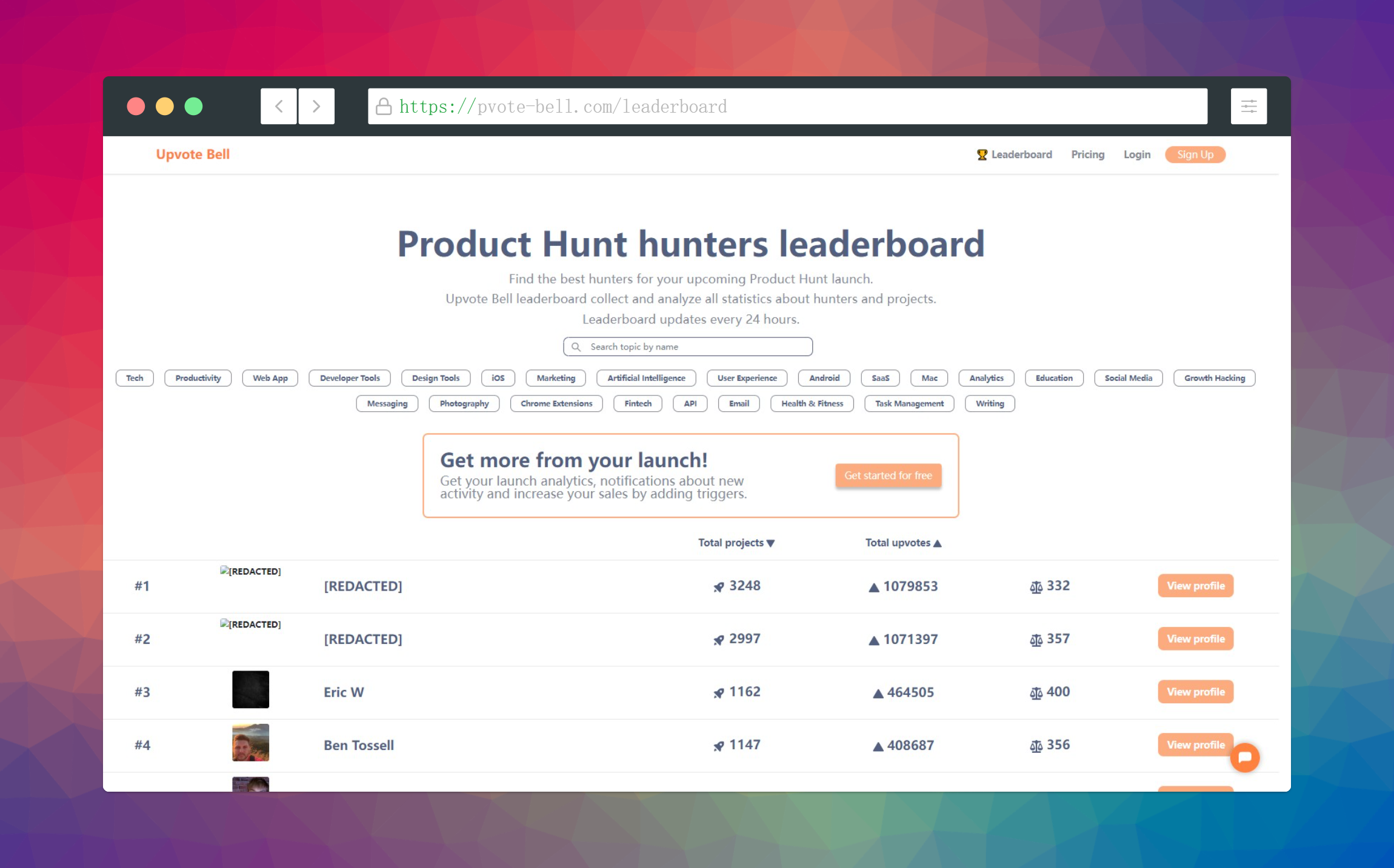 - There are many hunter-searching tools on the market, but I will only introduce one that I‘ve used and think is good, which is Upvote Bell. You can easily find the profiles of Top hunters and recently most active hunters on its leaderboard, as well as their number of followers and the number of products they have posted. The best part is that you can filter by specific category.