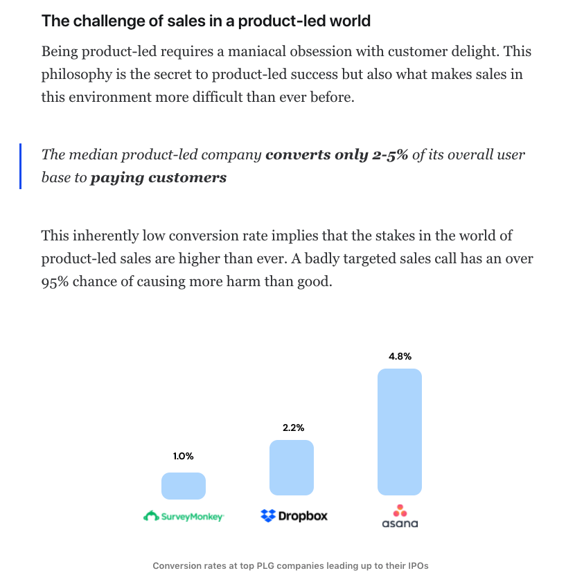Okay, so I’m hooked. PLG is the way to go. No more cold calls. Cheaper CAC. Evangelized customers. Easy upsell. Crushed competition.