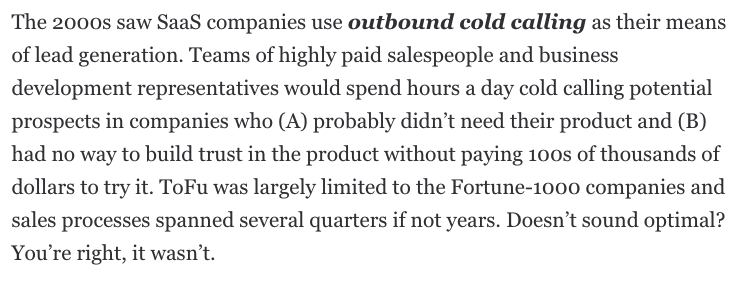 The promised land is presented as a place where you can acquire customers without cold calling prospects, you can acquire them cheaper than before, and freemium users will be early evangelists of your product since they’re already using it.