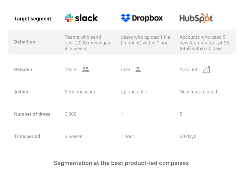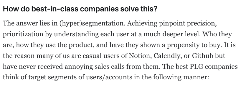 Time for a solution Ruchin then explains how the current winners of PLG use hyper segmentation to determine which customers should be contacted by a sales person to convert to a paying customer. And gives examples of Slack, Dropbox, and Hubspot.
