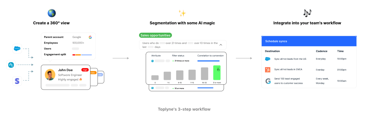 - Centralize data from siloed systems across product, billing, and CRMs to give a 360 view of users