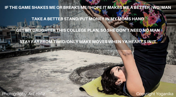If the game shakes me or breaks me / I hope it makes me a better (wo)manTake a better stand / Put money in my moms handGet my daughter this college plan, so she don’t need no manStay far from timid / Only make moves when ya heart’s in it