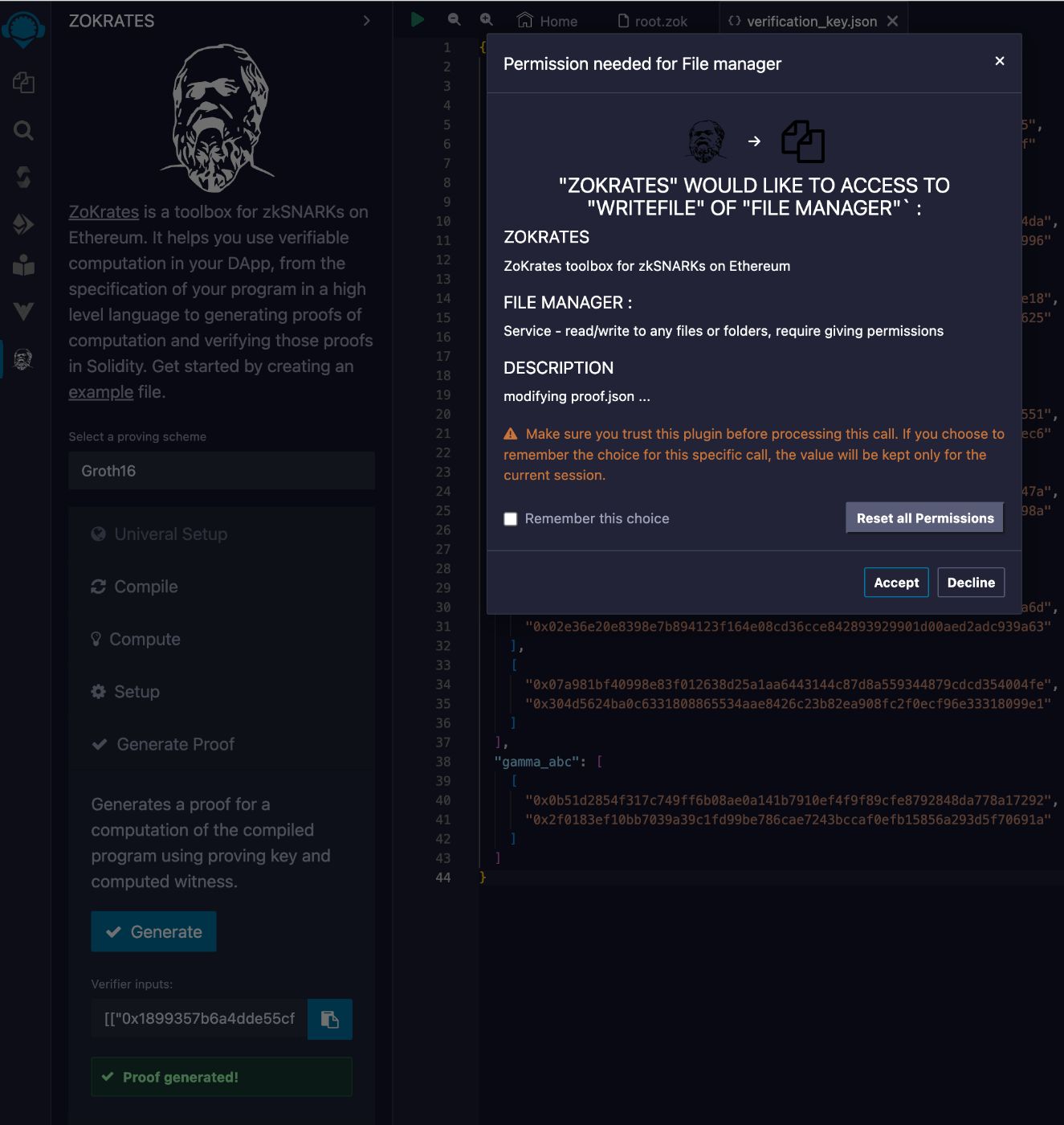 - Click the Generate button to generate a proof for computation of the compiled program using the proving key and computed witness.