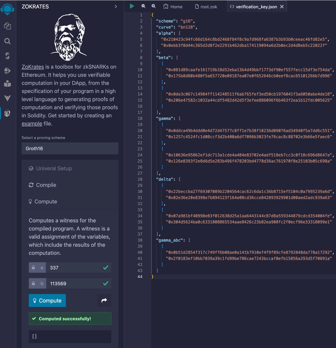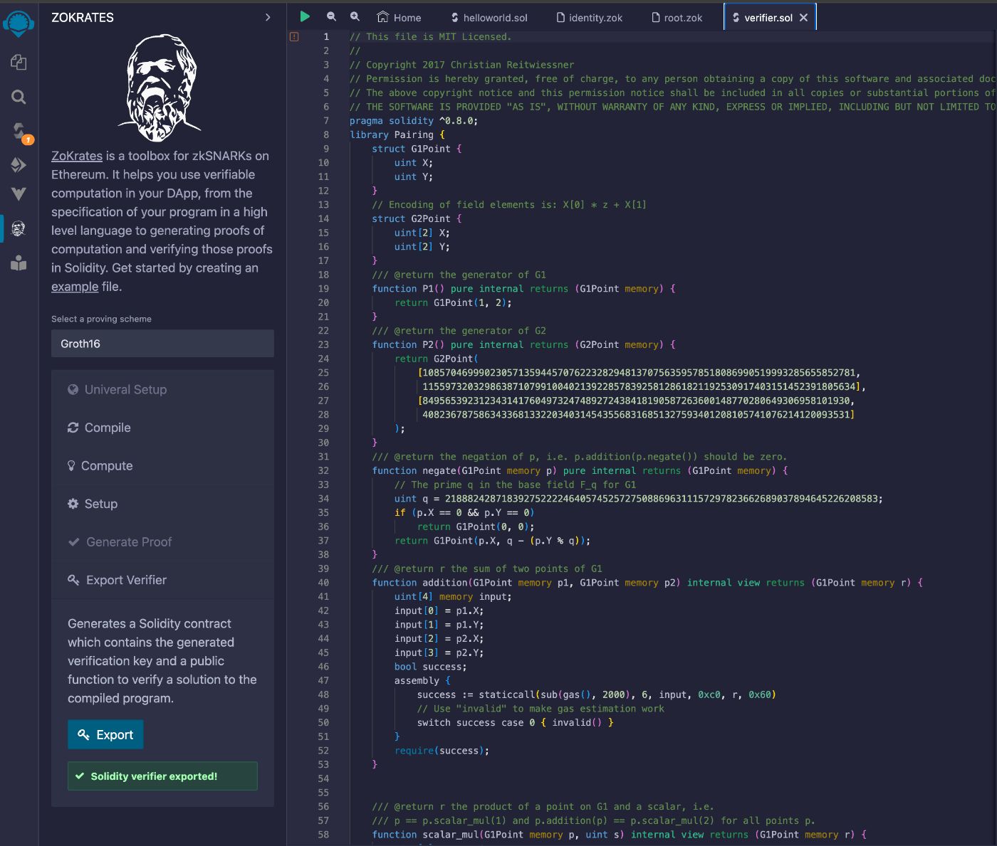 - Export Verifier and click the Export button; this generates a Solidity contract containing the generated verification key and a public function to verify a solution to the compiled program.