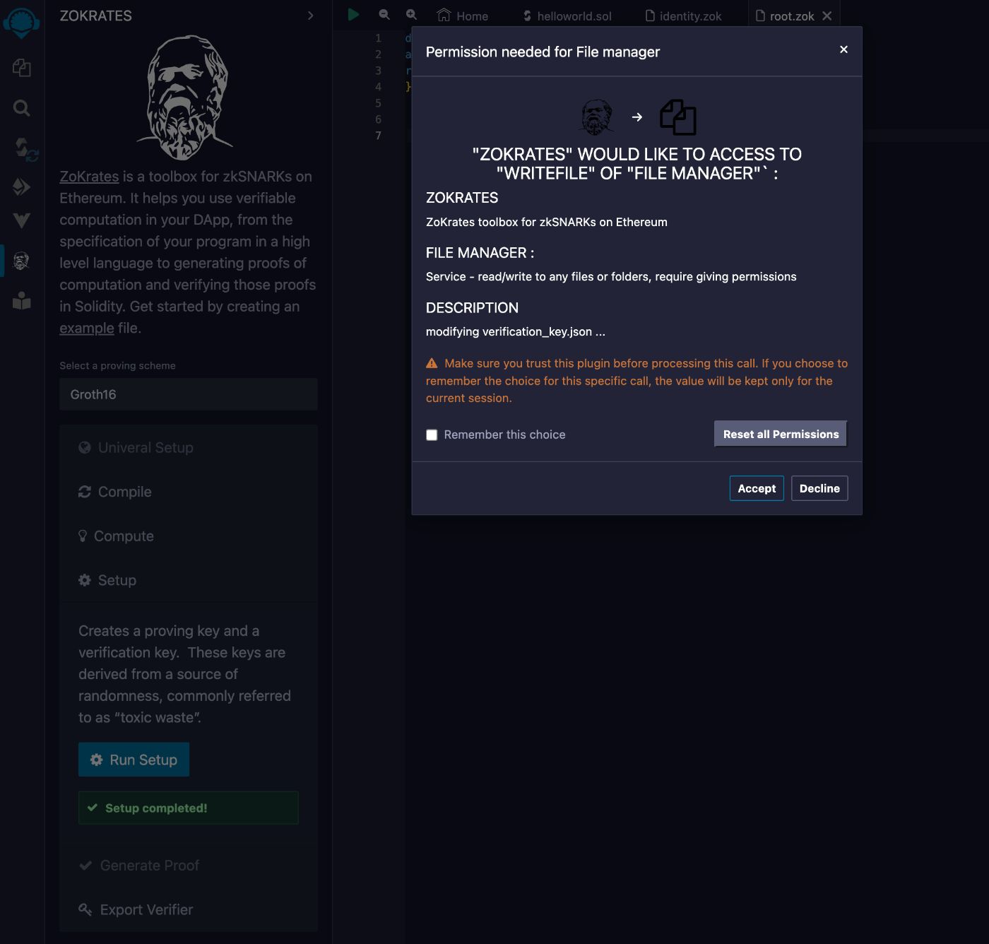 - Click on setup (Creates a proving key and a verification key); if the setup is successful, you will see this message. Click the