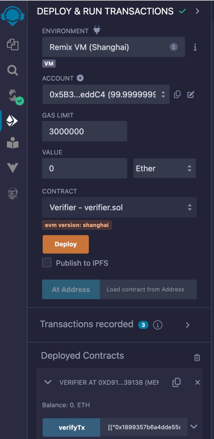To validate the proof, go to the Deploy & Run Transactions plugin, paste the remix-compatible parameters into the verifyTx field, and click the transact button.