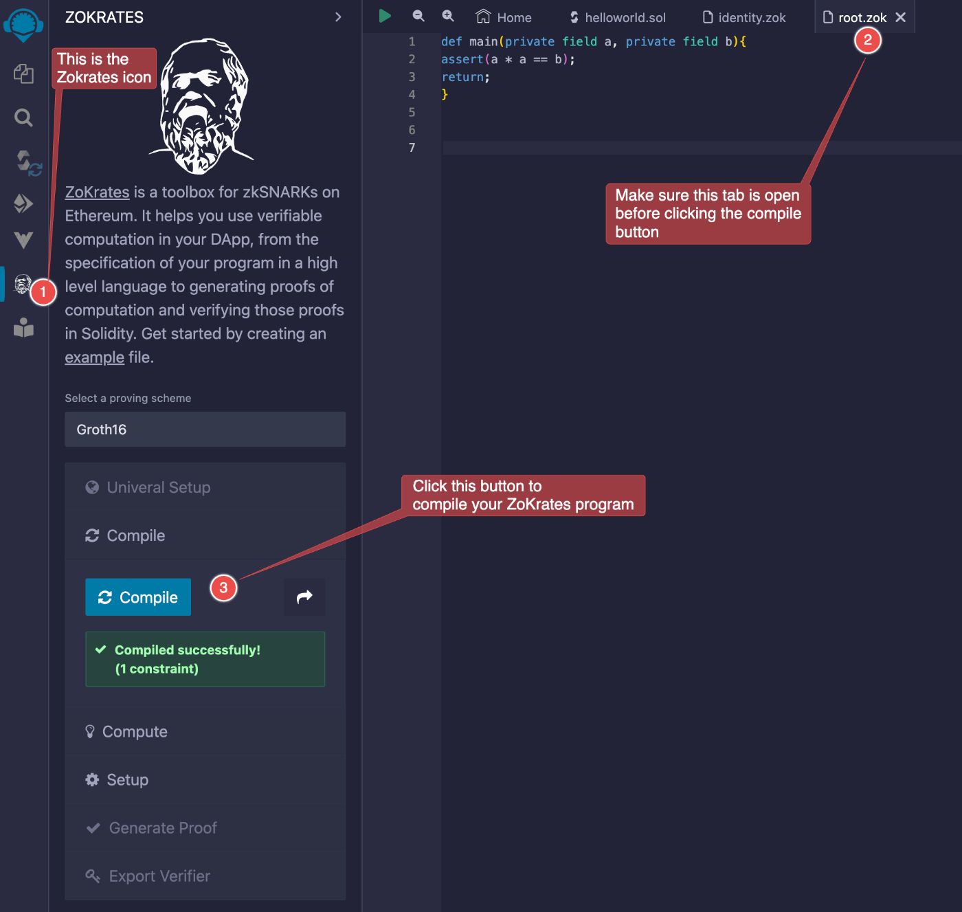 - Click on "Compile" to compile the ZoKrates program.