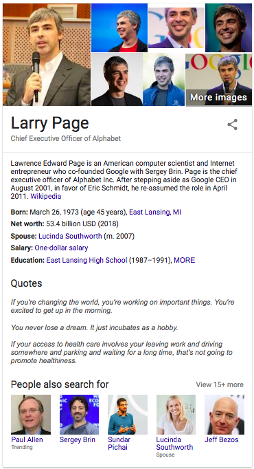 Example of a search powered by Google knowledge graph. When you search for “Larry Page” you see a feature called Knowledge Panel which extracts critical information from Google Knowledge Vault and serves it to users to provide contextual information.