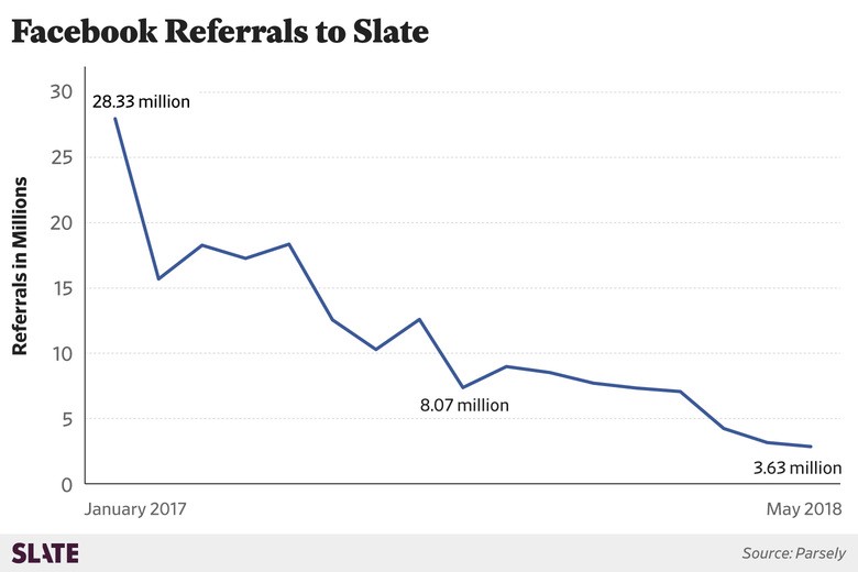 As Slate pointed out in the “The Great Facebook Crash” traffic from Facebook plummeted at a staggering 87 percent. In January 2017 Slate got more than 28 million clicks from Facebook, which became less than 4 million in May 2018. In an attempt to strengthen “meaningful relationships” (which is a way for Facebook to stay alive after the Cambridge Analytica data scandal) publishers are losing most of their organic traffic via Facebook as well. How are publishers responding?