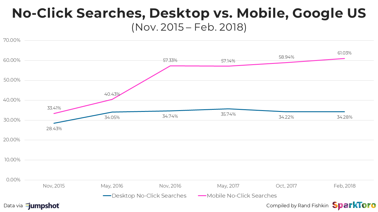 Both from desktop and mobile the no-click searches, for which the navigation of the user happens within Google’s search page result — have increased substantially. The effect is even stronger on Mobile. This means that Google is sending less traffic to those sites and we can expect this trend to consolidate in the next future.