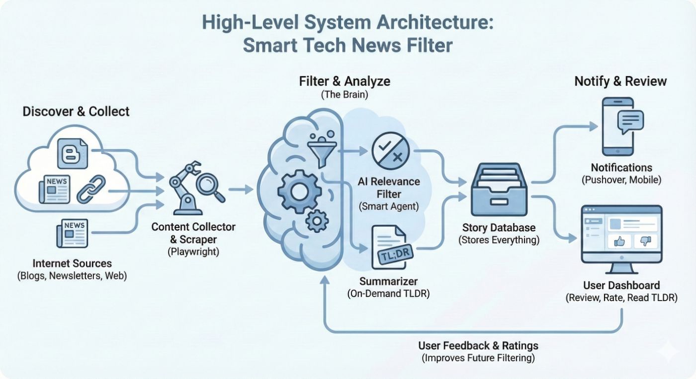 The logic behind the app was straightforward: grab stories from the web, categorize them, store them in a database, and send me a notification. Since the functiongemma model doesn’t have a built-in web search like the big players (Gemini or Claude), I set up Playwright with Node.js to scrape a specific list of whitelisted sites. Once the script gathered the links and metadata, the LLM would judge which ones were worth my time, sending a shortlist of the top five directly to my phone via Pushover.
