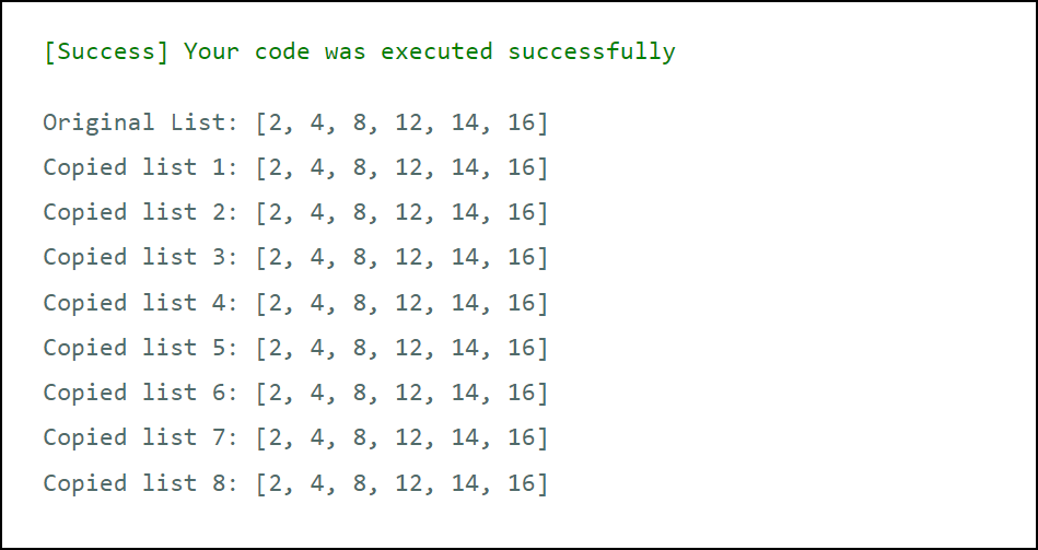 Eventually, In statement 38 we are printing the original list to the console and from 39 to 46 we have printed copied lists obtained by using various methods.