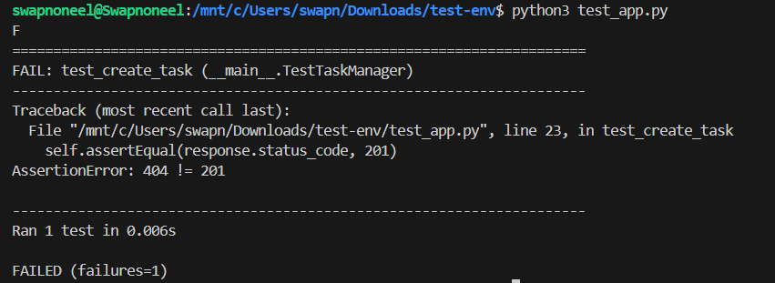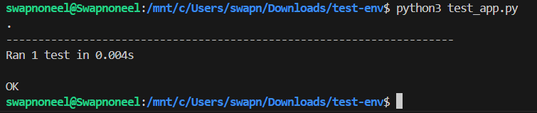 Now that our test case has been written, it's time to put it on some test. So, we need to run the command python3 test_app.py in the terminal to get the result of the test,