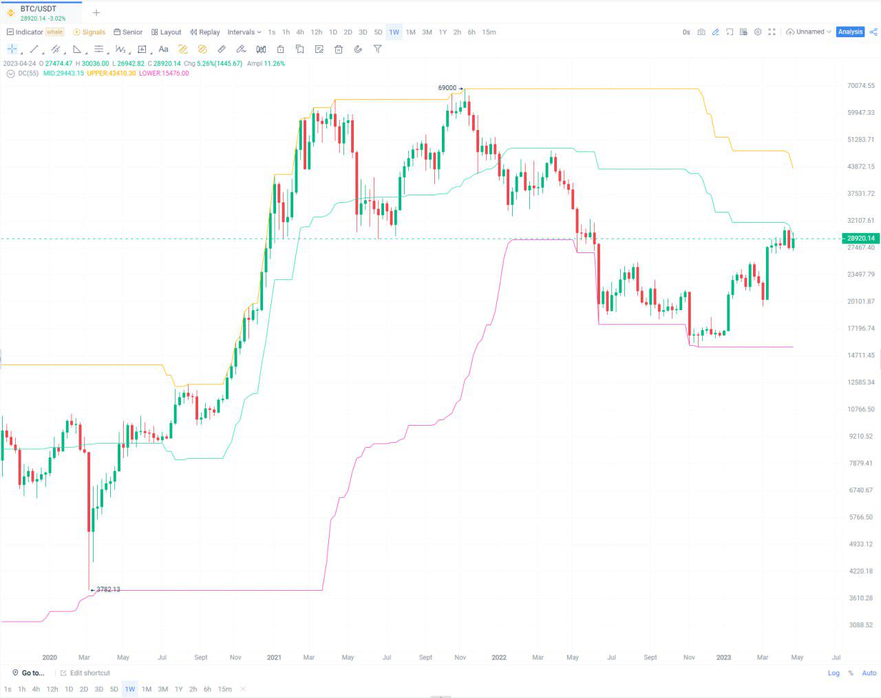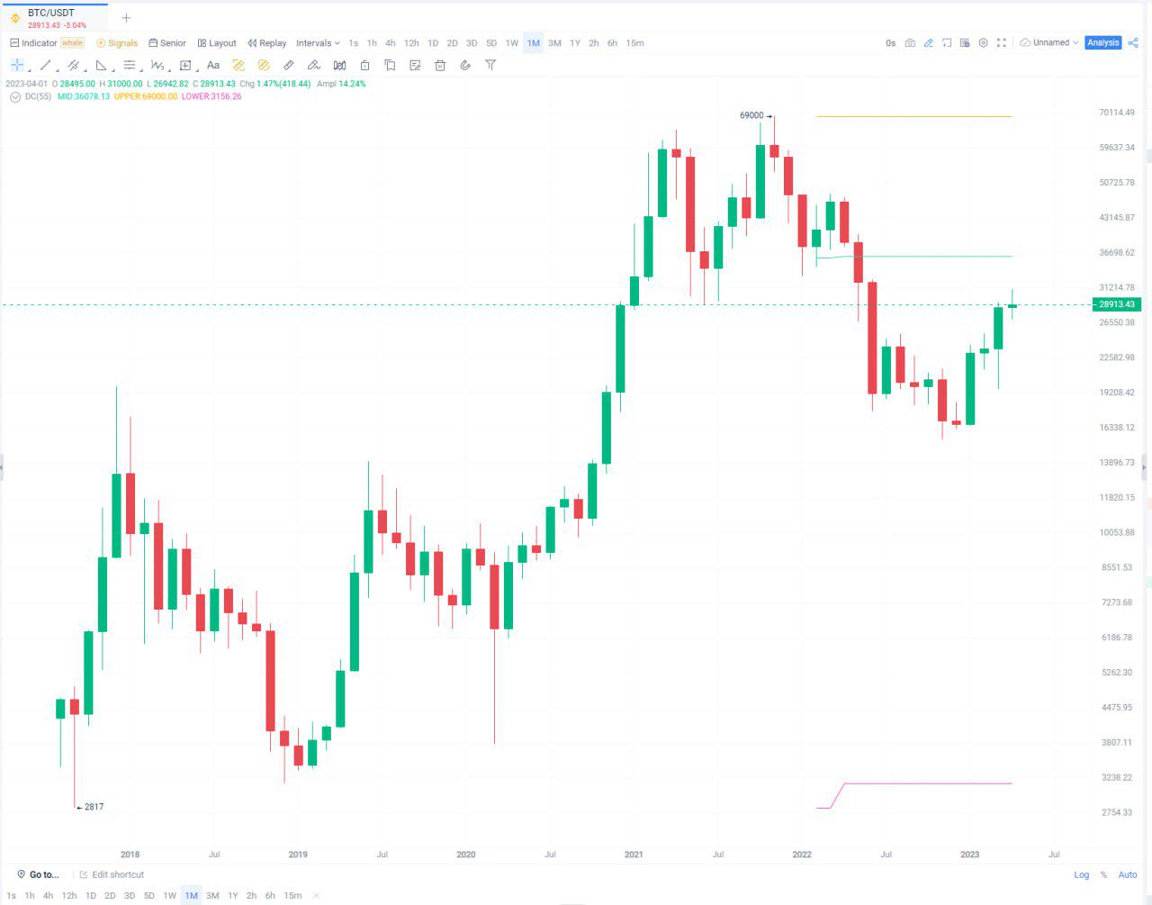Into a new quarter, BTC is also entering a new journey in terms of weekly and monthly lines. We applied the Donchian Channel (“DC”) indicator to assess the volatility of the market. (The indicator consists of an upper band, a lower band, and a middle band which usually represents the 20-day high, 20-day low, and the average respectively. When the prices are stable, the Donchian channels will be relatively narrow, and when there is heavy price fluctuation, the indicator channels will be wider.