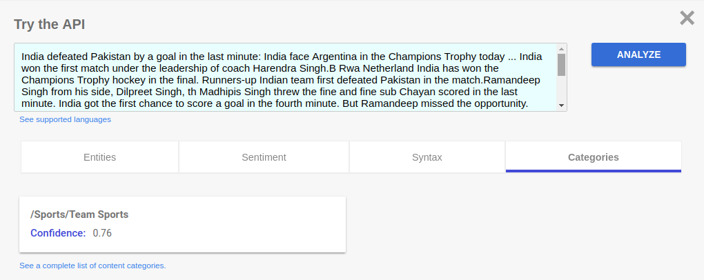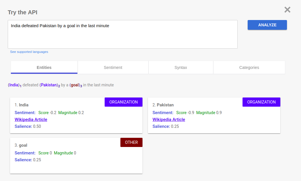 Once the Article is in text form a multitude of APIs are available to find out existing entities, sentiments etc .Examples of using the Google API are shown below.Google Language processing APIs expect the text to be translated to English first.